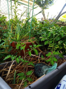 玄関前のプランターにはミニトマト(茶色っぽい紫色の)が植えられていますが、背が伸びて来ました。