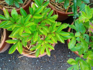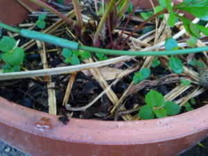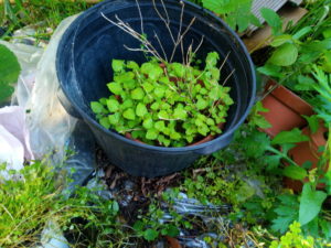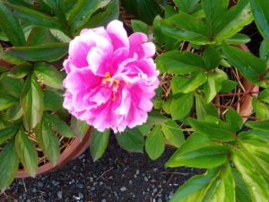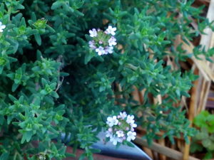 タイムの花が咲きました。8時を過ぎて気温が上がって来ました。芍薬の鉢に出ているのは縮緬紫蘇です。もう少し大きくしてから畝かプランターに移植します。