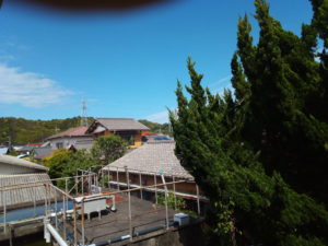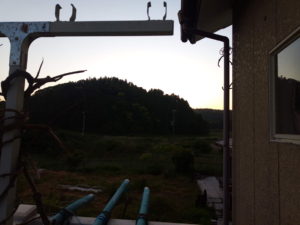 5時02分の撮影です。海上には未だ雲が在りますが、大半の雲は遥か沖に行ってしまいました。東の写真で烏が家の屋根の直ぐ上の電線に留って居ます。