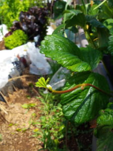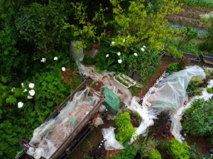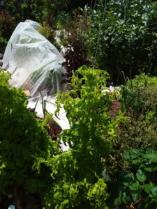 不織布が掛かっている処には、みさきキャベツの苗が在ります。濃い紫や鮮やかな緑があるのはレタスが花を上げています。画面の右下には玉葱が在りますので、形がきちんと見える様になるのは7月半ばです。移行には半年掛かりますね。