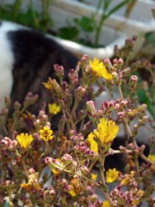 レタスの花が上がりました。交雑するかな?育ててみます。黄色い花がレッド・グルノーブル、緑のは名前が…分かりませんが一番食べ易いレタスです。