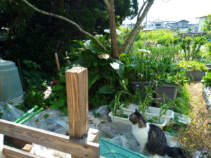 庭に出ると猫達が付いて来ます。福しか映って居ませんが、私の後ろには玩具を咥えた(?)うめもいました。