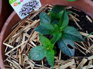 サンパチェンスオーキッドピンクに花芽が着きました。今年は鉢が空いていると他の花を植えてしまいそうなので、いきなり尺鉢に入れました。6月迄は何もせずにこのまま育て、一度ピンチします。そして、夏の炎天を感じられる頃にもう一度ピンチして、夏は小さい姿で送って貰います。
