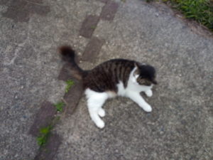 帰り道、福を呼ぶとうめが凄い勢いで飛んで来ました。薄暗闇では白いソックスしか見えません。今度は福が全速力で掛けて来ました。ニャ~ン、スリスリ!あれっ!?Tさんに行く前にお家に居れたタイガーさんが表に居ます(笑)。猫達は未だお遊び(活動)の時間です。