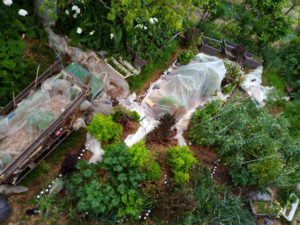 毎度同じな庭の写真ですが、この写真を見ていると地上に立った時に気付かない事も見えて来ます。今年は畝幅を変えて、未だ使いこなせているとは言えませんが、野菜を植える場所は増えました。発酵温床も順調に進んで居て、今日は45度でした。下手は下手なりにCharles Dowdingさんの真似が出来ています(笑)。今年は夏の菜園も放ったらかしにせず、確り収穫をしたいですね。トマトと茄子に絞って行きますので、胡瓜は福山さんの胡瓜を買う事にします。庭のオオムギ(手間いらず)が斜めになっている場所では背が高く育っています。平地では低いままです。