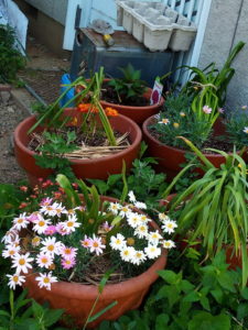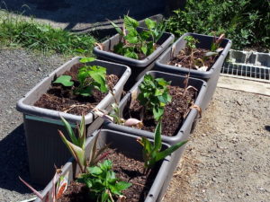 物干しと家の中を行き来しながら育てている汐留葱の5号鉢に植えてある内、背の高い方を7号の白プラ鉢に鉢増し、周りに防風用の厚手ビニールをしました。背の低い方はもう少し背が伸びてから鉢増しします。7月にジャガイモを収穫したらプランターには緑色のスリット鉢の葱が定植されます。そろそろ汐留葱を冬用に播種して置いた方が良いのかなぁ。
