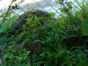 西隣さん、ザルをS字フックで掛けさせてね~。此処は朝8時までは日が当たり、その後は午後14時頃迄日陰で涼しい風が通り抜けます。梅干し干すのも此処が良いなぁ…浄化槽の上ではあるけれど(笑)。