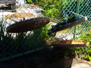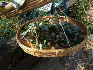 既に竹ざるは干してあるから、其処へどんどん乗せて行きます。3枚用意して良かった。ビショビショのドクダミがどんどん重ねられます。左は先日刈って4―5日ほしたのかな?嵩が減りますよねぇ。真ん中が今日刈ったもの。右は、上のザルも未だ一杯になっていません。
