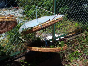 一番目のザルは乾燥完了です。後で擂粉木で細かくします。二番目のザルと三番目は未だ生です。明日は曇りだけど、何処まで乾燥出来るかなぁ。