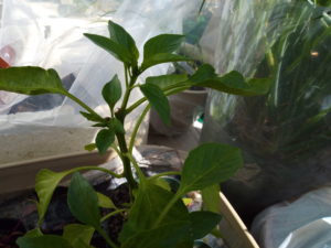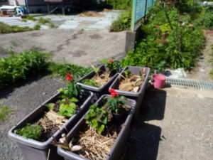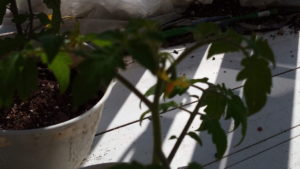 物干しではピーマンデカチャンプが剪定した主軸の両脇の芽を育てています。トマトは第一花が着きました。でも、私が名札を失くしてしまったためにどっちがどっちか分かりません(笑)。