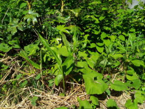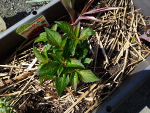 ネモフィラの後、挿し穂を採るお芋を植えました。寂しいので、庭の矢車草の傍に植える筈だったサルビア赤を置いてみました。アクセントの強い色が必要みたいです。梅の樹冠下では鉄砲ユリが伸びて来ました。真ん中あたりに在りますが、緑だらけ!分かるかなぁ…。
