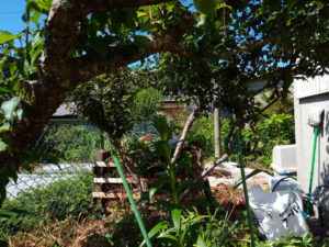 先日、スーパーゆうきを施して茅を敷いた茗荷は太く育って来ました。右の写真は昨日大きな草を取り除き、すーぱ-ゆうきを茗荷のある辺りに撒きました。