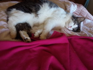 開け放した南西の窓からは、午後の心地よい風が入って来ます。福は私のベッドのタオルケットの上で昼寝中です。夜は赤い毛布の上で寝ていますが、昼間は木綿のタオルケットが好きな様です。