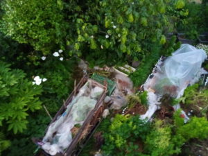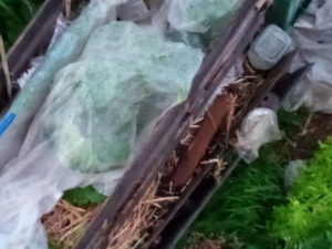 おたふくさんのプールの手すりに大きな雨粒が付いて居ます。発酵温床の不織布からは南瓜の葉が見えて来ました。いよいよ這い回るのでしょうか。両脇の2株は未だ半分位の大きさです。昨日の発酵温床の地温は42度位でしたね。
