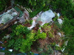 朝の雨後の空気が冷たくて気持ちが良いです。禅寺丸柿に雌花が着きました。発酵温床の前に立って居るのは左からジャガイモ、そしてレタスです(笑)。白く見えるのが発酵温床で不織布を持ち上げている南瓜です。