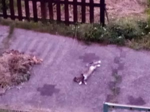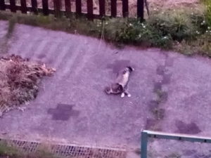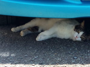 写真を撮って居るとニャ~!と呼びかけて来る福の声がします。何処にもいません。ア、居た、居た。其処は涼しいよねぇ。一緒に家に入って来ました。その後、お隣のお兄ちゃんが出勤。福の日陰はお出かけです。福とうめがちゅ~る+カリカリ鰹節乗せを食べました。