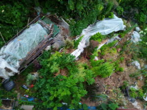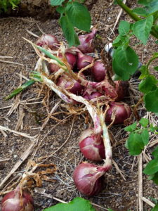 右: 通路の邪魔になる処だけ大き目の赤玉葱を抜いて乾かします。小さいのはマダマダあります。白い玉葱は100本、赤は倍の値段だったので、50本しかしませんでした。今年の秋はレタスを減らして玉葱赤を100本に増やします。