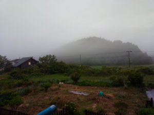 上の雲が西南西に伸びているのかを確認しようとしたら、目に映ったのはこんな風景でした。東も靄っています。この時季は温かい海水が近付いて居ますから霧が確かに多くはなるのです。昨年も濃霧が6月に何回かありましたのをアルバムを見ながら感じて居ました。