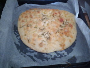 お風呂から出て洗濯機を回しながら、フォカッチャの仕上げをし、200度20分の焼きに入りました。20分で焼き色が足らなかったので…中段でやったせいかな?…5分追加しました。捏ねも不要で簡単です。発酵は状態待ちで放りっぱなしでした。ローズマリーの生葉が二階まで匂って来ました。今日の午後のおやつ?です。