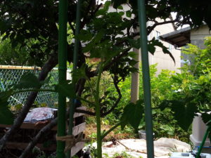 お昼を回るとようやく日が当たる玄関脇のうめの樹冠下にある、トマト、トスカーナバイオレットです。出来るだけお日様に当る様にギリギリ枝を回しています。