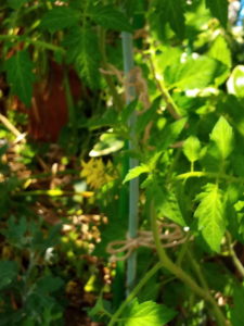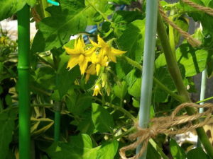中: 奥にあるトマト先に花が開きましたが、結実は1―2個かな。