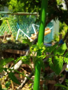 左: 玄関脇のトマトの支柱を太くしました。3本見える内の一番左です。直径は19㎜か20㎜あります。