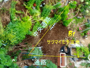 見慣れない方にはどこが畝だか分からない世界ですね。天気予報がクルクルと変わり、月曜日が晴れになったから、B1畝の整備をしようかな。