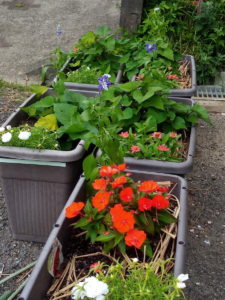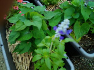 ゆあぱーくさんで買ったサルビアストラータ4株はサツマイモとサンチュラカとジニアとサンパチェンスオレンジと一緒です。曲がって居るのは一昨日の強風で植える前だったので、寝かしていたら起き上がった時の寝ぐせ?
