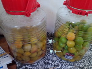 右:  梅の果汁が上がって来ました。左の瓶は1㎏先に漬けたので、進みが早いです。EM梅3㎏を足しましたが、色も直ぐに変わり果汁もかなり上がって来ました。