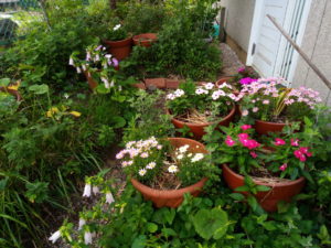 左:  発酵温床を横から撮りました。味平南瓜の黄色い花が中にあるのが見えますか?雨が止んだら親蔓を切りましょう。自由な子蔓、孫蔓を働きに出そう。