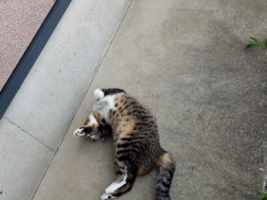 9時前、福とうめがカリカリを食べに帰って来ました。私もそろそろご飯の準備をしましょう。風が一寸変わったので、水切れしたものは家の中に取り入れました。雨はまた遅れているようです。11時頃?うめが『オカアシャン、お土産よ~』と全長60㎜程度の大き目の虫を持ってきてくれました。きっと『朝ご飯でシーバデュオを入れてくれたお礼よ~』なのかな?