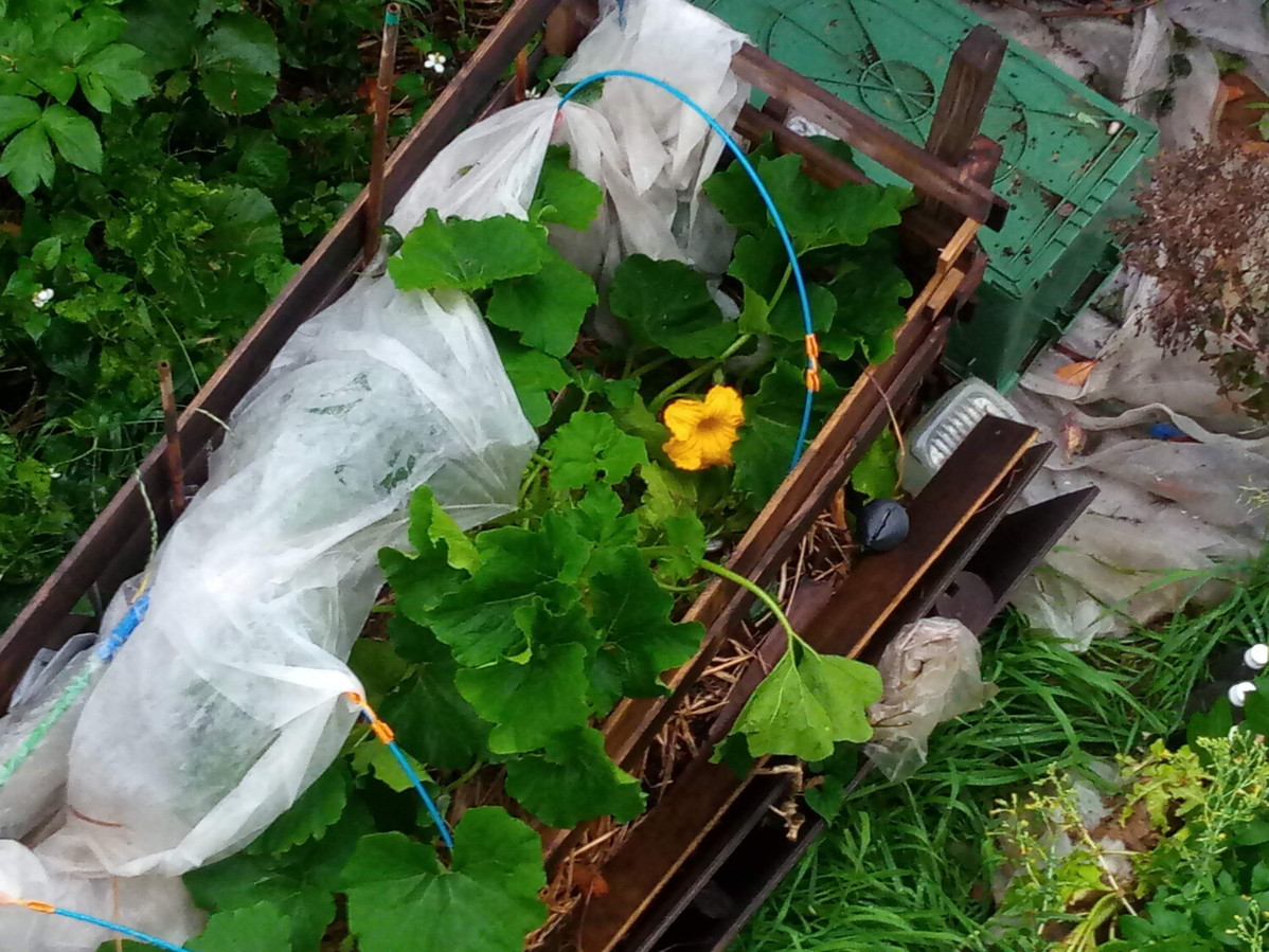 左:  発酵温床を横から撮りました。味平南瓜の黄色い花が中にあるのが見えますか?雨が止んだら親蔓を切りましょう。自由な子蔓、孫蔓を働きに出そう。