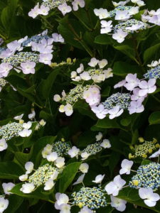 左と中:  Eさんのお家の紫陽花です。私が町中の紫陽花で一番好きなガクアジサイです。