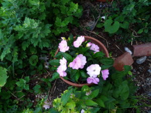右:  今の玄関前はホタルブクロと園芸種が一緒くたです。この写真を撮って居たら、二階で寝ていたうめが『オカアシャ~ン、何してるの~?うめも行くから待っていてね。』と物干しから声を掛けて来ました。