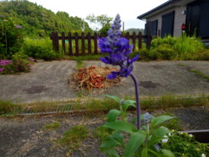 右:  我が家。ゆあぱーくさんで買ったサルビアストラータを植えました。4株、背の高い、紫色の花を着けています。花穂が曲がって居るのは強風でしたので、植える前に横にしていたら花穂だけが起き上がって来ました。凄いパワーです。