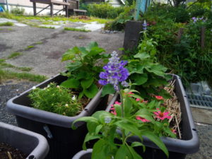ゆあぱーくさんで買ったサルビアストラータ4株はサツマイモとサンチュラカとジニアとサンパチェンスオレンジと一緒です。曲がって居るのは一昨日の強風で植える前だったので、寝かしていたら起き上がった時の寝ぐせ?