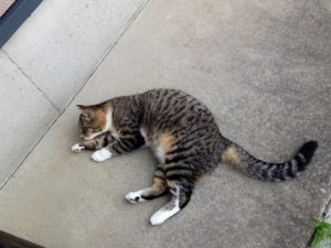 9時前、福とうめがカリカリを食べに帰って来ました。私もそろそろご飯の準備をしましょう。風が一寸変わったので、水切れしたものは家の中に取り入れました。雨はまた遅れているようです。11時頃?うめが『オカアシャン、お土産よ~』と全長60㎜程度の大き目の虫を持ってきてくれました。きっと『朝ご飯でシーバデュオを入れてくれたお礼よ~』なのかな?