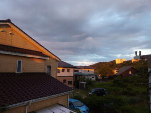 18時58分、東の窓から北側だけが茜色に染まって居るのが見えました。慌てて北側の写真を撮りに行きました。
