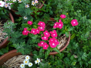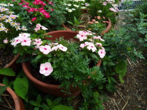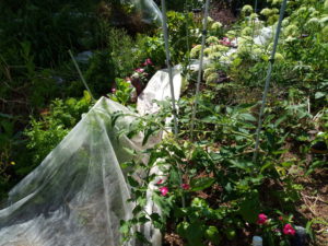 此処で一つ気付いたのが茄子とピーマンの支柱の立て方でした。私が今まで見ていた方々は大きくなるにつれ、支柱を高くしていらっしゃいましたが、多収を図るプロ農家さんは収穫時のやりやすさ、日当たりの良さ等、を考慮した低めのアーチ…多分高さは1mは無いです…そこにアーチにプラ紐を4本位掛けて木を安定させ、丁度、収穫がてらの葉欠きをしていらっしゃいました。これは我が家の様に狭い庭では有難い技術です。