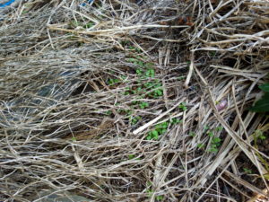 ロケット(セルバチコ、或いはルッコラ)の芽が出て来ました。シシリアンルージュの生長点を支柱に結びました。