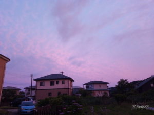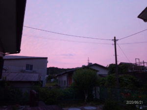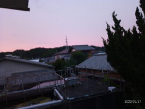 pcを打っていると南西の景色がチラリと見えました。何やらピンク掛かったオレンジ色の光が目に飛び込んで来ました。4時49分、慌てて東の窓に駆け寄りました。10分で茜色は消えました。