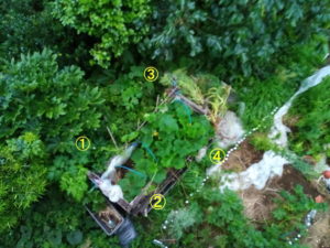 南瓜には4本の蔓が見えます。黄色で数字を振りましたが、見えますか?辺りを観察しているようです。