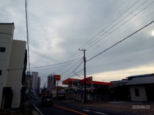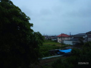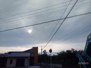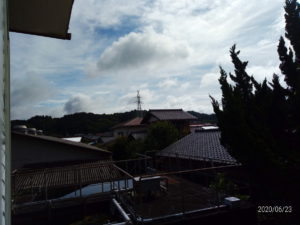 最低気温19度台、最高気温24度台、曇り、梅雨前線は500㎞程離れて南下しています。風はめまぐるしく北寄り、南南西、西と変わり、午後になり南南西に安定し、風力は大体5―7m前後です。