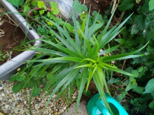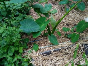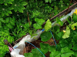 蔓を採らせて貰った芋たちがまた茂って来ました。西瓜には雄花が着き始めました。もう少ししたら摘心します。