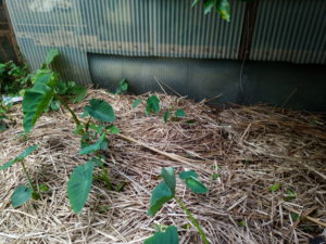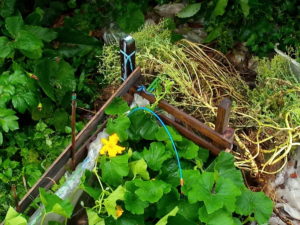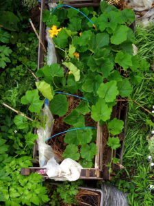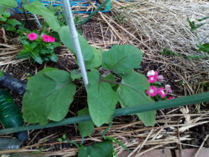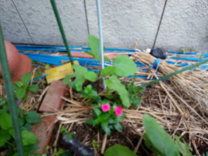 味平南瓜の蔓が表に出ています!早いですね。未だか、未だか、と思っていたらいつの間に飛び出したのでしょう。いつも想定外の蔓の走り方には笑ってしまいます。でも、蔓には確かに目が在って、あっちに木があるぞ、とか感じ取って居ます。