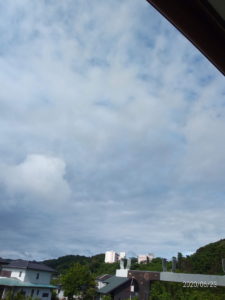 現在の空です。青空が微かに見え隠れしています。8時、気温が上がって来ました。洗濯ものも乾きそうな気配です。トラちゃんが出掛けたので、うめが戻って来ています。