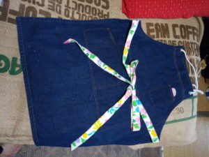 私は昨日に引き続き、エプロンづくりに夢中です。洗い物をする度に油を含んだ水が跳ねてTシャツを汚すんです。これは堪らない!!、という訳で、昔、板橋区のビバホームで買ったのかな?1枚500円位の厚地デニムの、如何にもトコトン無駄は出しません、というカットの、紐で首に掛けるタイプのエプロンに手を入れる事にしました。(追記: 丈はもう少し短くても良いな。ベストをチョと長くした感じが丁度良いです。春夏秋の最初は背中が要らないもんね。)