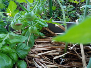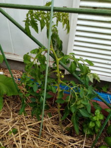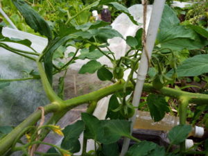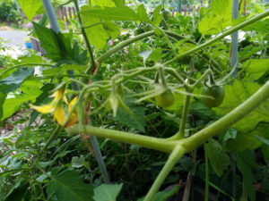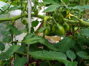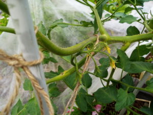 此方はシシリアンルージュです。第一番果房は大きな実が一つですが、未だ花が着いています。行灯仕立ては時間がある人向きではあるけれど、メリットは地上から低いので、根が吸う栄養が実に行きやすい、そして日当たりが良いのでこの後の色付きに影響して来るのでしょう。やってみないと分からないものですね。これが鉢仕立てならきっとお日様を追って回す事も出来るでしょう。