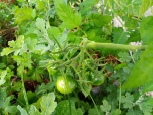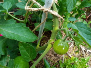 ミニトマトの長い房は見ていても気持ちが良いです。こんな風にして管理して日当たり、風通しを確保するんですね。それをしないと良品が出来ない。我が家のトマトは中玉だから房付きが違います。