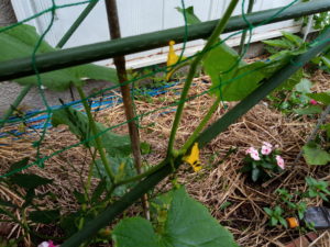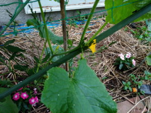 胡瓜節生りと夏涼みには、下段の蕾を処理後に雌花の蕾が中段で着いて来ました。